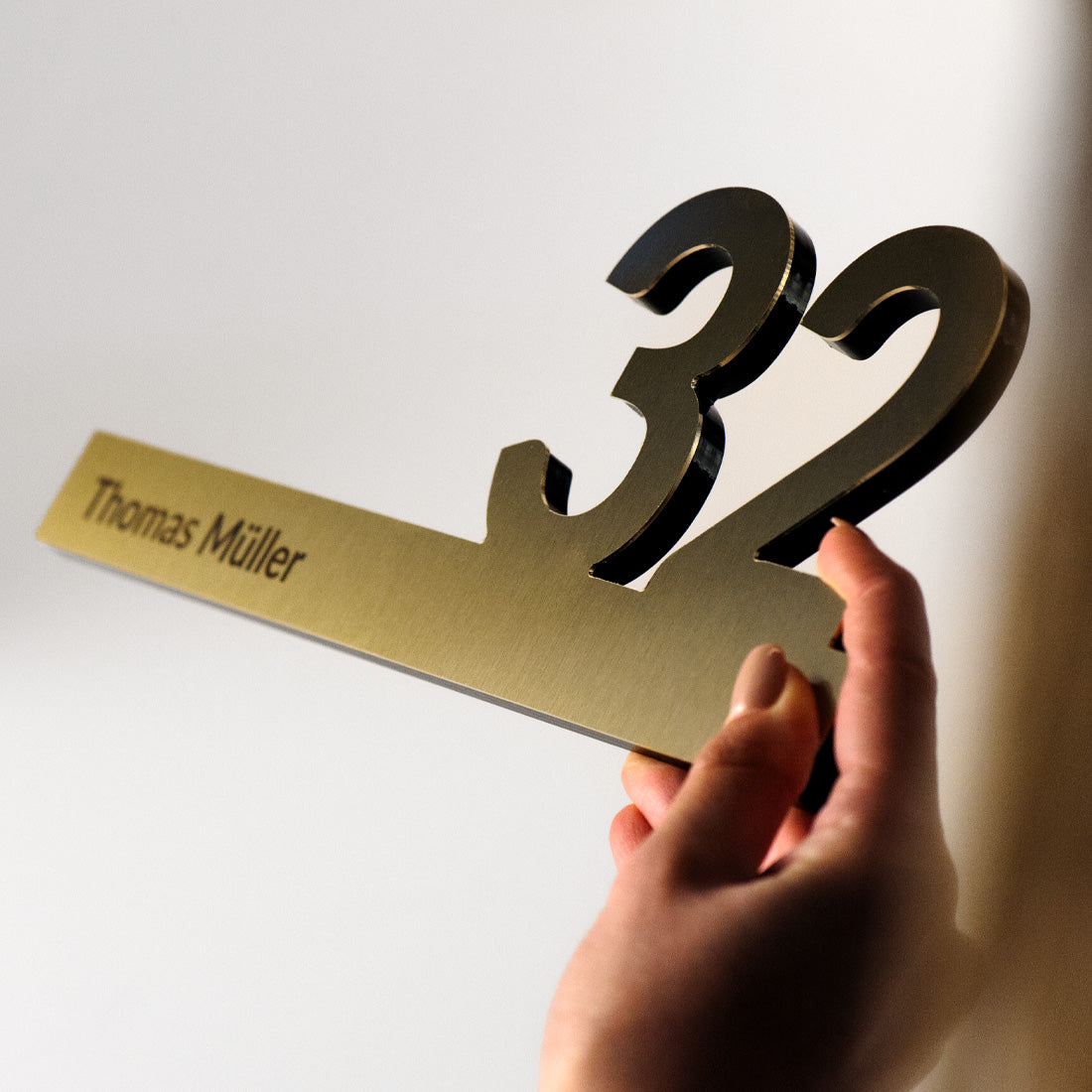 - Design personalizzato e minimale: Line Brass combina linee pulite e forme essenziali per trasformare il numero civico in un vero elemento di design. La sagomatura del numero e l’incisione laser del testo permettono di creare composizioni personalizzate, con nomi, cognomi o vie, in equilibrio estetico e armonioso.